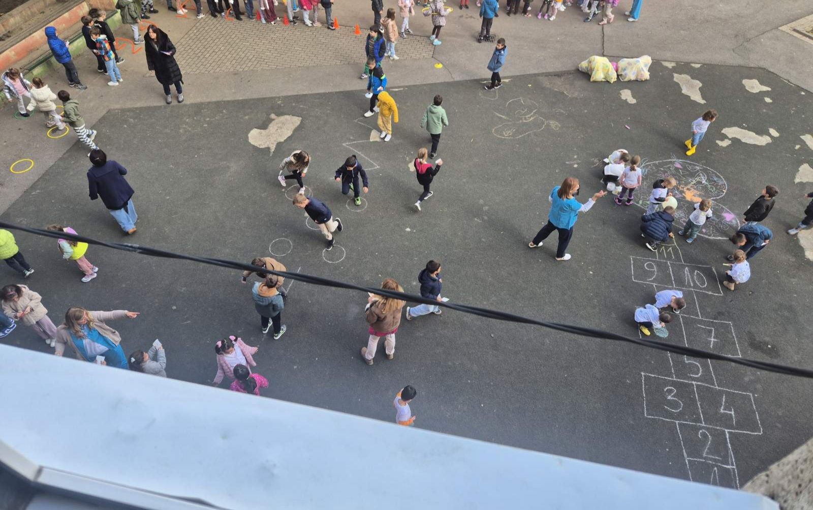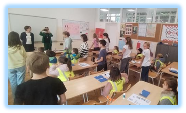 Прва слика приказује активности које смо организовали у дворишту са учитељицама и ученицима првог разреда. Свака група је имала свој пункт на ком је било потребно урадити одређени задатак да би се добио печат у боји групе. Када дете сакупи 4 печата завршило је све задатке.